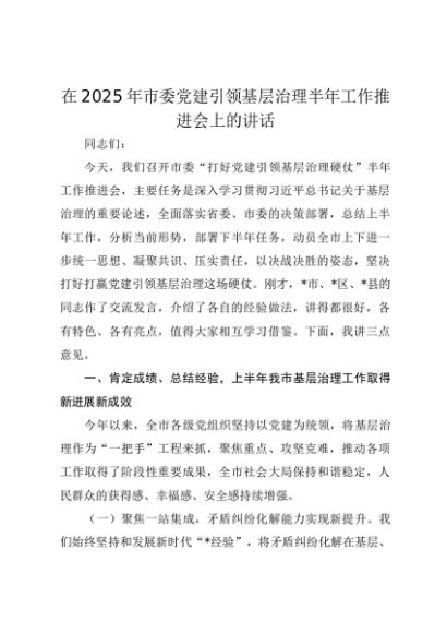 【七哥公文】2025年:在2025年市委党建引领基层治理半年工作推进会上的讲话(1)+更多免费公文+VX:QiGeGongWen2024