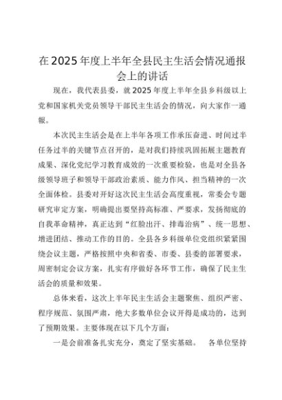 【七哥公文】2025年:在2025年度上半年全县民主生活会情况通报会上的讲话+更多免费公文+VX:QiGeGongWen2024