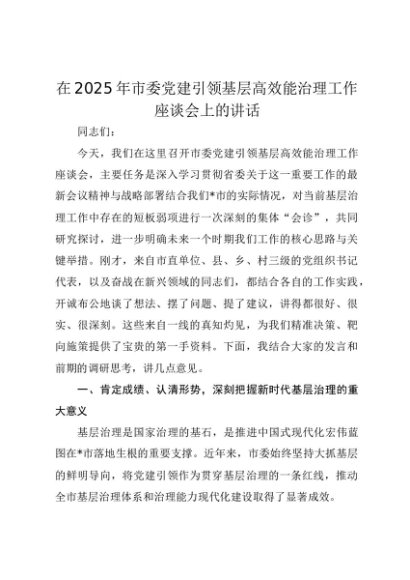 【七哥公文】2025年:在2025年市委党建引领基层高效能治理工作座谈会上的讲话+更多免费公文+VX:QiGeGongWen2024