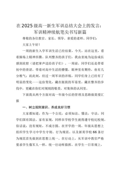 【七哥公文】2025年:在2025级高一新生军训总结大会上的发言:军训精神续航笔尖书写新篇(1)+更多免费公文+VX:QiGeGongWen2024