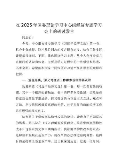 【七哥公文】2025年:在2025年区委理论学习中心组经济专题学习会上的研讨发言(1)+更多免费公文+VX:QiGeGongWen2024