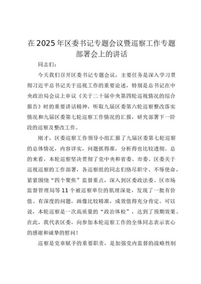 【七哥公文】2025年:在2025年区委书记专题会议暨巡察工作专题部署会上的讲话(1)+更多免费公文+VX:QiGeGongWen2024