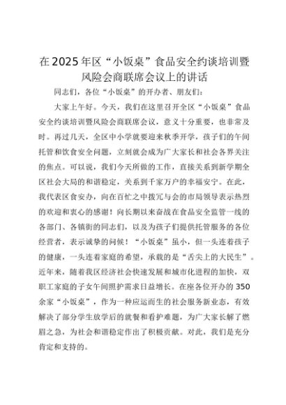 【七哥公文】2025年:在2025年区“小饭桌”食品安全约谈培训暨风险会商联席会议上的讲话(1)+更多免费公文+VX:QiGeGongWen2024