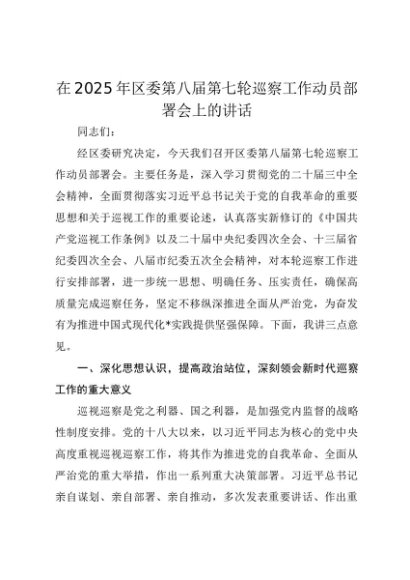 【七哥公文】2025年:在2025年区委第八届第七轮巡察工作动员部署会上的讲话+更多免费公文+VX:QiGeGongWen2024