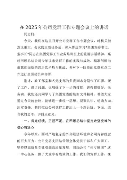 / 【七哥公文】2025年:在2025年公司党群工作专题会议上的讲话+更多免费公文+VX:QiGeGongWen2024