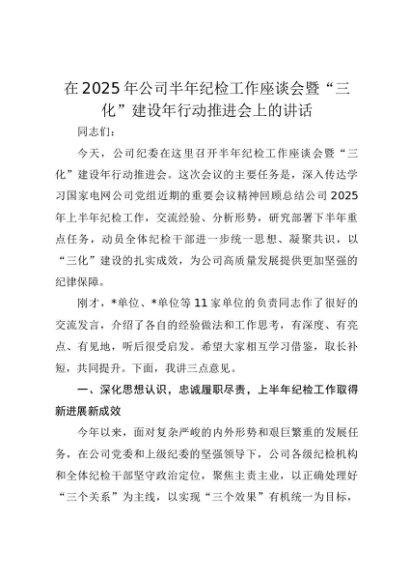 【七哥公文】2025年:在2025年公司半年纪检工作座谈会暨“三化”建设年行动推进会上的讲话+更多免费公文+VX:QiGeGongWen2024