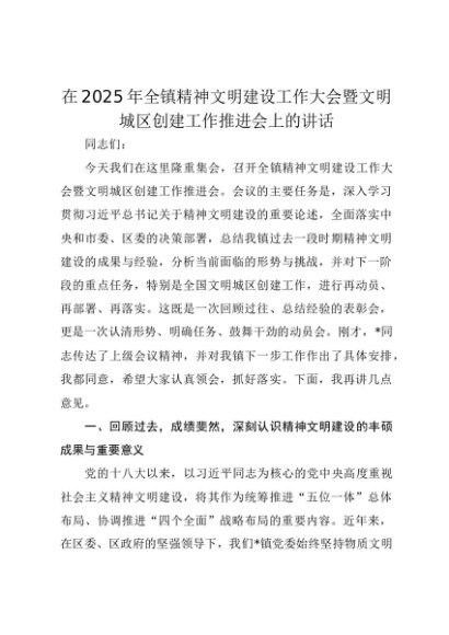 【七哥公文】2025年:在2025年全镇精神文明建设工作大会暨文明城区创建工作推进会上的讲话+更多免费公文+VX:QiGeGongWen2024