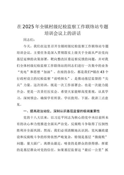 【七哥公文】2025年:在2025年全镇村级纪检监察工作联络站专题培训会议上的讲话(1)+更多免费公文+VX:QiGeGongWen2024