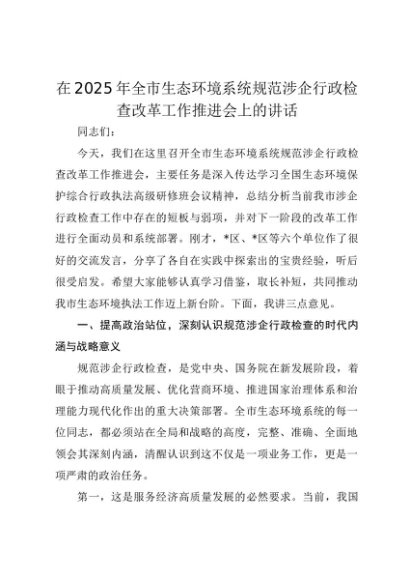 【七哥公文】2025年:在2025年全市生态环境系统规范涉企行政检查改革工作推进会上的讲话+更多免费公文+VX:QiGeGongWen2024