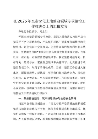 【七哥公文】2025年:在2025年全市深化土地整治领域专项整治工作推进会上的汇报发言+更多免费公文+VX:QiGeGongWen2024