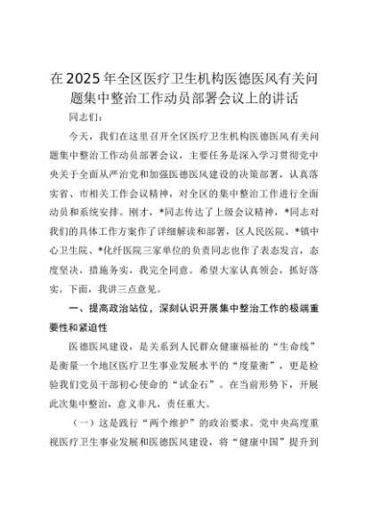 【七哥公文】2025年:在2025年全区医疗卫生机构医德医风有关问题集中整治工作动员部署会议上的讲话+更多免费公文+VX:QiGeGongWen2024