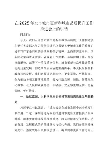 【七哥公文】2025年:在2025年全市城市更新和城市品质提升工作推进会上的讲话(1)+更多免费公文+VX:QiGeGongWen2024