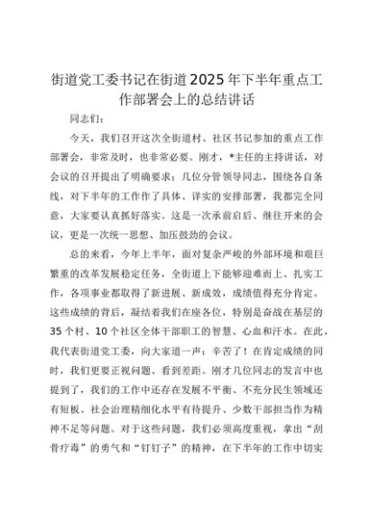 【七哥公文】2025年:街道党工委书记在街道2025年下半年重点工作部署会上的总结讲话+更多免费公文+VX:QiGeGongWen2024