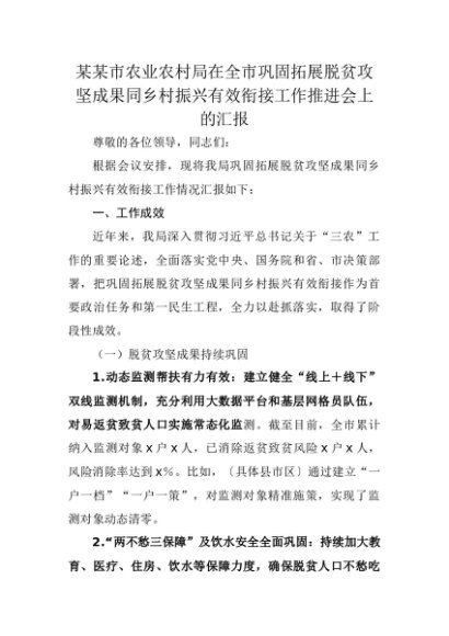 【七哥公文】2025年:某某市农业农村局在全市巩固拓展脱贫攻坚成果同乡村振兴有效衔接工作推进会上的汇报+更多免费公文+VX:QiGeGongWen2024