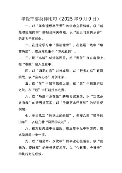 【七哥公文】2025年:年轻干部类排比句(2025年9月9日)(1)+更多免费公文+VX:QiGeGongWen2024
