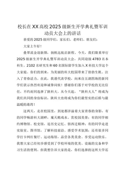 【七哥公文】2025年:校长在XX高校2025级新生开学典礼暨军训动员大会上的讲话(1)+更多免费公文+VX:QiGeGongWen2024