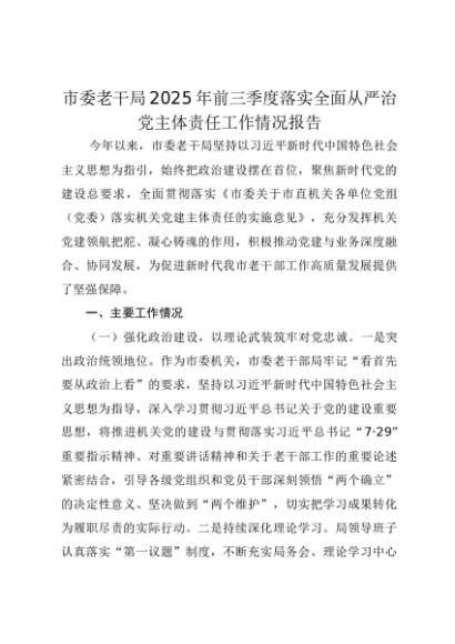 【七哥公文】2025年:市委老干局2025年前三季度落实全面从严治党主体责任工作情况报告+更多免费公文+VX:QiGeGongWen2024
