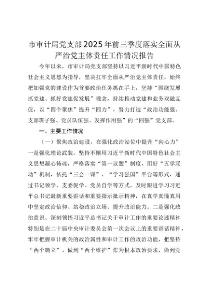 【七哥公文】2025年:市审计局党支部2025年前三季度落实全面从严治党主体责任工作情况报告+更多免费公文+VX:QiGeGongWen2024