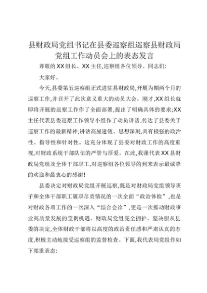 【七哥公文】2025年:县财政局党组书记在县委巡察组巡察县财政局党组工作动员会上的表态发言(1)+更多免费公文+VX:QiGeGongWen2024
