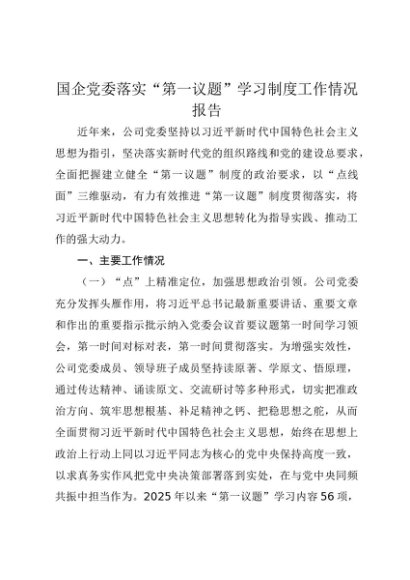 【七哥公文】2025年:国企党委落实“第一议题”学习制度工作情况报告(1)+更多免费公文+VX:QiGeGongWen2024