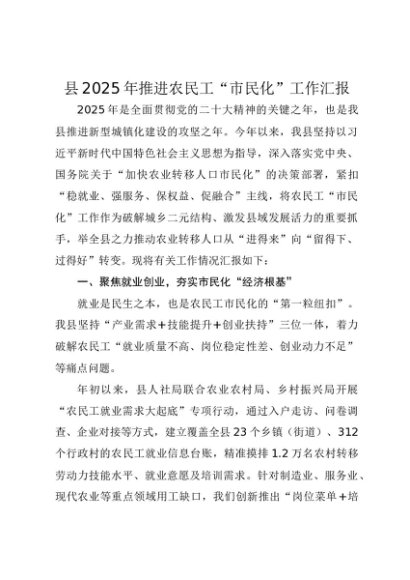 / 【七哥公文】2025年:县2025年推进农民工“市民化”工作汇报+更多免费公文+VX:QiGeGongWen2024