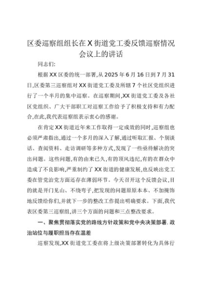 【七哥公文】2025年:区委巡察组组长在X街道党工委反馈巡察情况会议上的讲话+更多免费公文+VX:QiGeGongWen2024