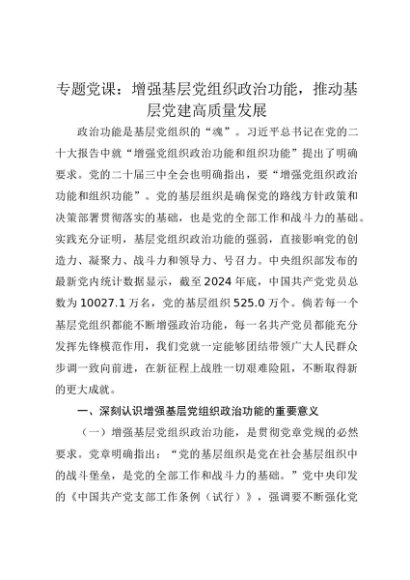 【七哥公文】2025年:党课讲稿:增强基层党组织政治功能,推动基层党建高质量发展(1)+更多免费公文+VX:QiGeGongWen2024