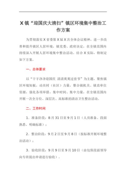 / 【七哥公文】2025年:X镇“迎国庆大清扫”镇区环境集中整治工作方案+更多免费公文+VX:QiGeGongWen2024