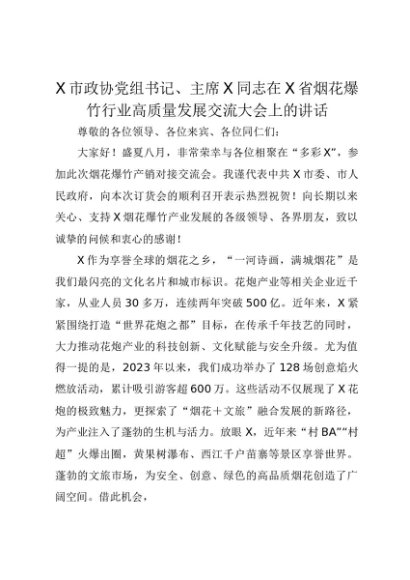 【七哥公文】2025年:X市政协党组书记、主席X同志在X省烟花爆竹行业高质量发展交流大会上的讲话(1)+更多免费公文+VX:QiGeGongWen2024