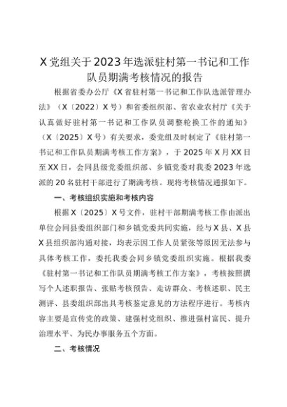 【七哥公文】2025年:X党组关于2023年选派驻村第一书记和工作队员期满考核情况的报告+更多免费公文+VX:QiGeGongWen2024