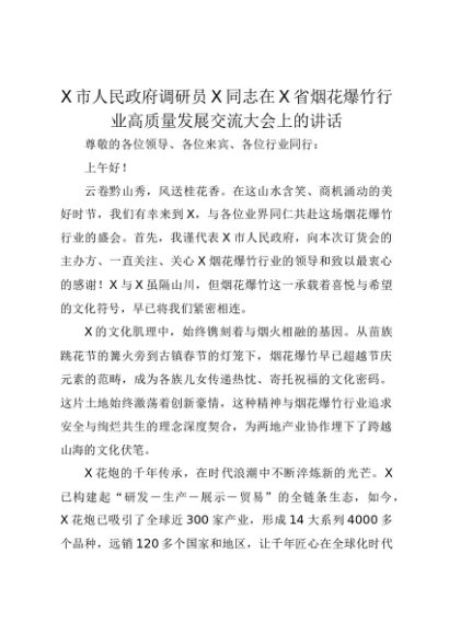 【七哥公文】2025年:X市人民政府调研员X同志在X省烟花爆竹行业高质量发展交流大会上的讲话+更多免费公文+VX:QiGeGongWen2024