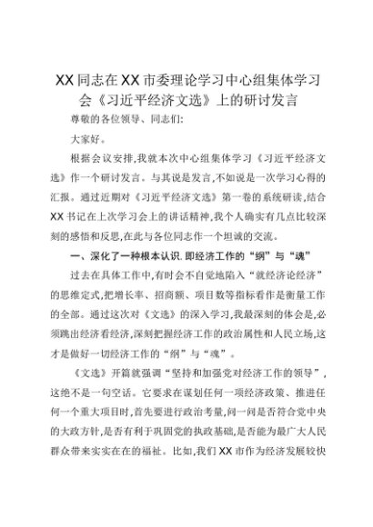 【七哥公文】2025年:XX同志在XX市委理论学习中心组集体学习会《习近平经济文选》上的研讨发言+更多免费公文+VX:QiGeGongWen2024