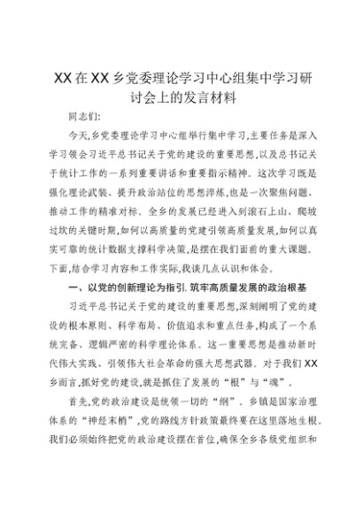 【七哥公文】2025年:XX在XX乡党委理论学习中心组集中学习研讨会上的发言材料+更多免费公文+VX:QiGeGongWen2024