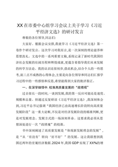 【七哥公文】2025年:XX在市委中心组学习会议上关于学习《习近平经济文选》的研讨发言(1)+更多免费公文+VX:QiGeGongWen2024