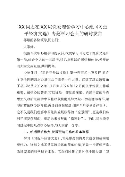 【七哥公文】2025年:XX同志在XX局党委理论学习中心组《习近平经济文选》专题学习会上的研讨发言(1)+更多免费公文+VX:QiGeGongWen2024