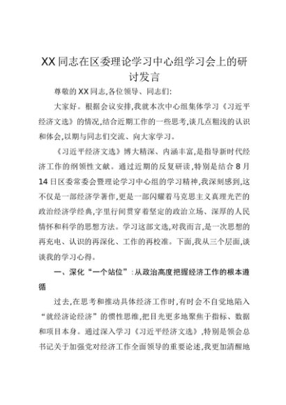 【七哥公文】2025年:XX同志在区委理论学习中心组学习会上的研讨发言(《习近平经济文选》第一卷)+更多免费公文+VX:QiGeGongWen2024