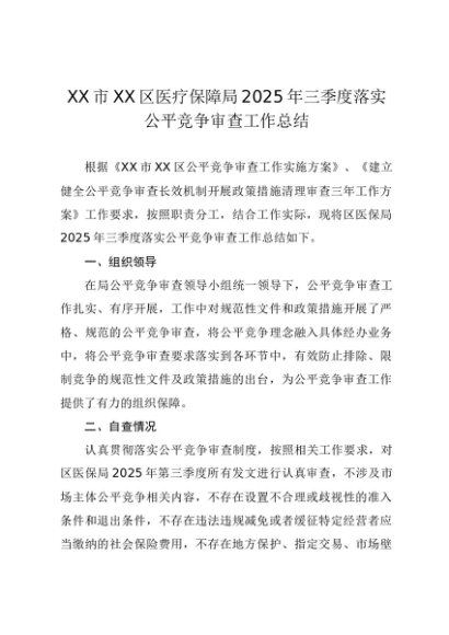 【七哥公文】2025年:XX市XX区医疗保障局2025年三季度落实公平竞争审查工作总结(1)+更多免费公文+VX:QiGeGongWen2024