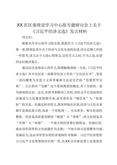 【七哥公文】2025年:XX在区委理论学习中心组专题研讨会上关于《习近平经济文选》发言材料+更多免费公文+VX:QiGeGongWen2024