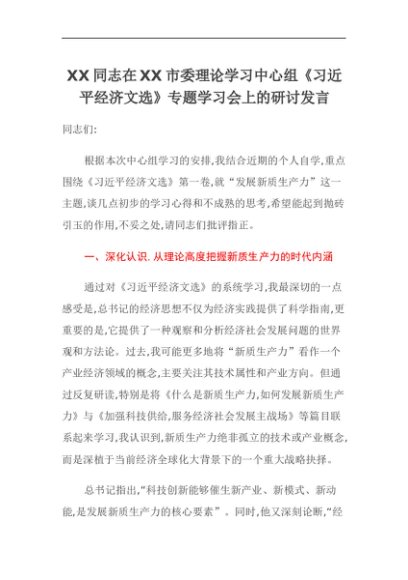 【七哥公文】2025年:XX同志在XX市委理论学习中心组《习近平经济文选》专题学习会上的研讨发言+更多免费公文+VX:QiGeGongWen2024