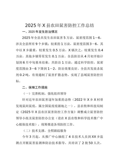 / 【七哥公文】2025年:2025年X县农田鼠害防控工作总结(1)+更多免费公文+VX:QiGeGongWen2024
