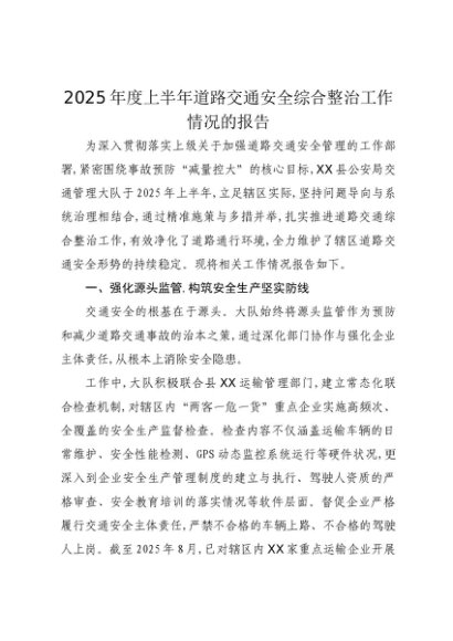 【七哥公文】2025年:2025年度上半年道路交通安全综合整治工作情况的报告+更多免费公文+VX:QiGeGongWen2024