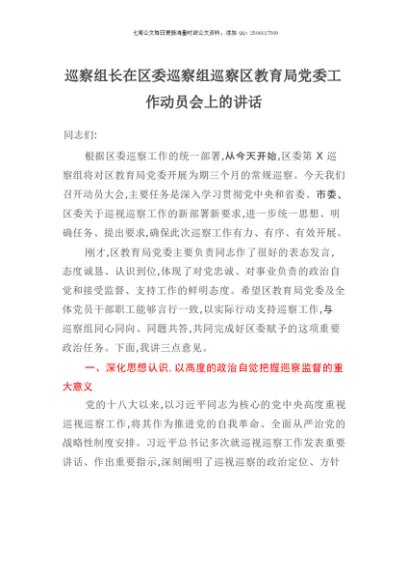 【七哥公文】2025年:巡察组长在区委巡察组巡察区教育局党委工作动员会上的讲话+更多免费公文+VX:QiGeGongWen2024