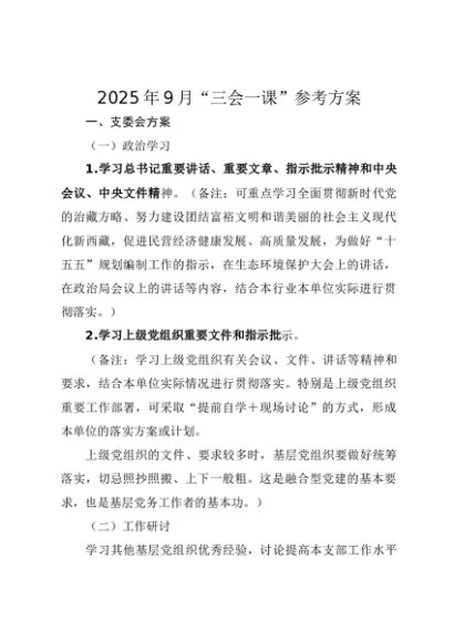 / 【七哥公文】2025年:2025年9月“三会一课”参考方案(1)+更多免费公文+VX:QiGeGongWen2024
