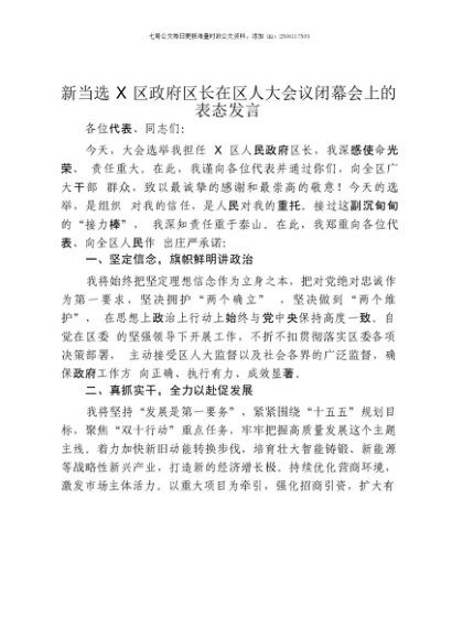 【七哥公文】2025年:新当选X区政府区长在区人大会议闭幕会上的表态发言+更多免费公文+VX:QiGeGongWen2024