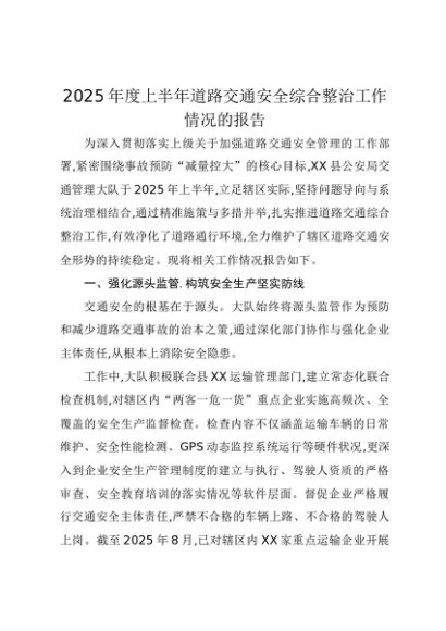 【七哥公文】2025年:2025年度上半年道路交通安全综合整治工作情况的报告(1)+更多免费公文+VX:QiGeGongWen2024