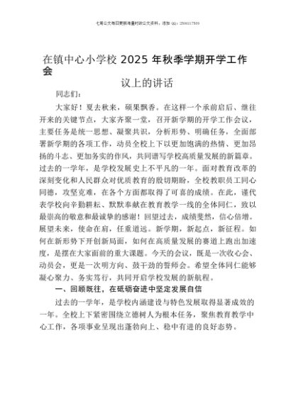 【七哥公文】2025年:在镇中心小学校2025年秋季学期开学工作会议上的讲话+更多免费公文+VX:QiGeGongWen2024