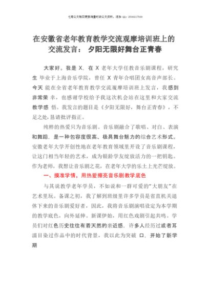 【七哥公文】2025年:在安徽省老年教育教学交流观摩培训班上的交流发言:夕阳无限好舞台正青春+更多免费公文+VX:QiGeGongWen2024