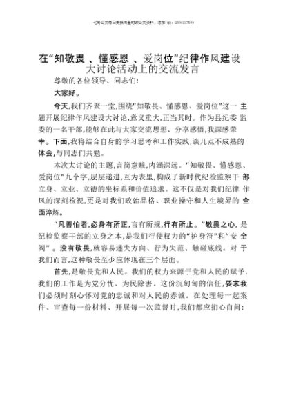 【七哥公文】2025年:在“知敬畏、懂感恩、爱岗位”纪律作风建设大讨论活动上的交流发言+更多免费公文+VX:QiGeGongWen2024