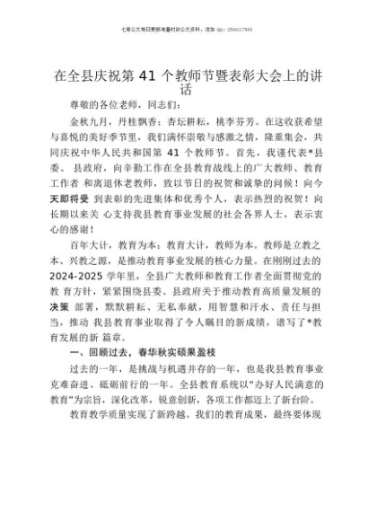 / 【七哥公文】2025年:在全县庆祝第41个教师节暨表彰大会上的讲话+更多免费公文+VX:QiGeGongWen2024