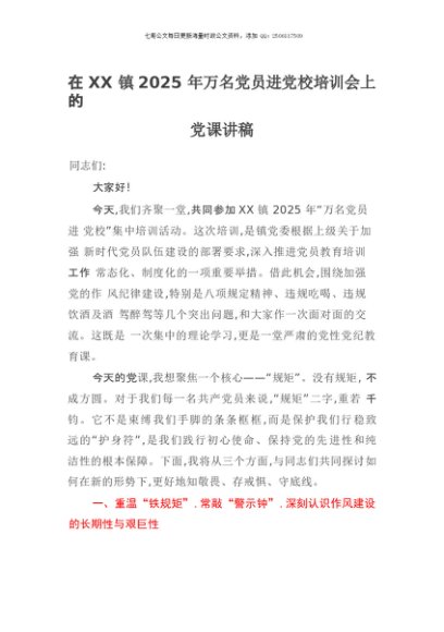 【七哥公文】2025年:在XX镇2025年万名党员进党校培训会上的党课讲稿+更多免费公文+VX:QiGeGongWen2024